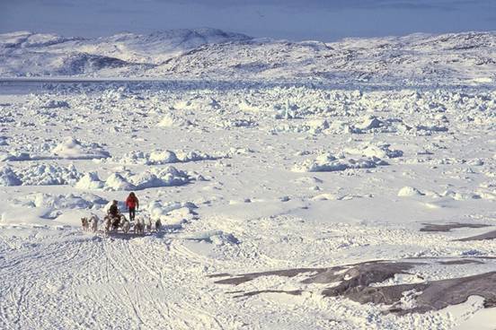 Steep red cliffs line the frozen sea - ravens engage in spring courtship rituals, cawing and croaking overhead. By 2:30pm, we hump over the final pressure ridge, coming to a stop at ‘Innarsuup Nuua’ a point of land that projects into the fiord. There are other groups of people here, apparently hunting seal and ptarmigan but so far, no luck.