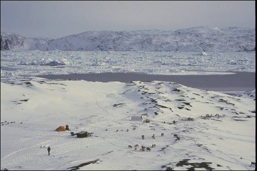 Camp is breaking up – many sleds loaded with families and their gear have already departed. At noon, we are one of the last to still be packing. The sun climbs higher, warming the air from –10C this morning to –2C. Dressed same as yesterday (poly pro long johns, goose down pants, gortex rain pants, thin super wool hiking socks), I’m ready to sit on the komatik. (Top layer is thin poly long sleep turtleneck, light weight poly mid weight, 300 weight poly fleece, down goose jacket handy if the wind blows and wind stopper jacket).