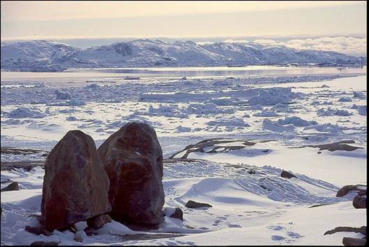 Alfred and I wander over the snow free, smooth scraped granite rock. Patches of snow reveal tracks of the elusive ptarmigan, also fox and a set of ski tracks. “Tourists”, says Kaaleeraq. Round rabbit pellets have been rolled by the wind, collecting in the small rock divets that sprout grassy tufts. It’s a calm serene landscape, the peace amplified by the monochromatic whiteness of sea and sky where horizon is undistinguishable.