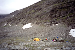 No sunset tonight as the fog has started to descend in earnest. Wolf music matches the mystic mood. There is no green valley anymore just rocks and scree and fog. It’s dead calm and the lack of wind adds to the spooky feeling. I ‘m glad for the presence of other hiking companions!