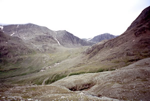 There are numerous unnamed side streams that drop from the 2500’ slopes. Snow packs melting in the hot weather of recent days are causing what should be trickles to swell into torrents. Perhaps it was a winter with heavy late snows. Eventually we are forced up along the slope’s shoulder as the McCormick River disappears into a deep rut, lined with unstable boulders. The stars of the show remain the sides of the valley: ribbons of water freely coursing down rocky slopes intermingled with vegetation that looks like velvet from a distance. Deep side valleys invite further exploration.