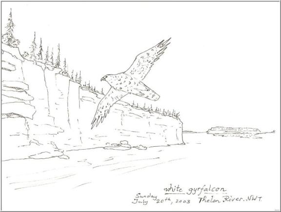 Alfred sketches the gyrfalcon which came out of the cliff so suddenly, no one could get a photograph. The bird flew low, his black eyes glittering…a close encounter of the avian kind.